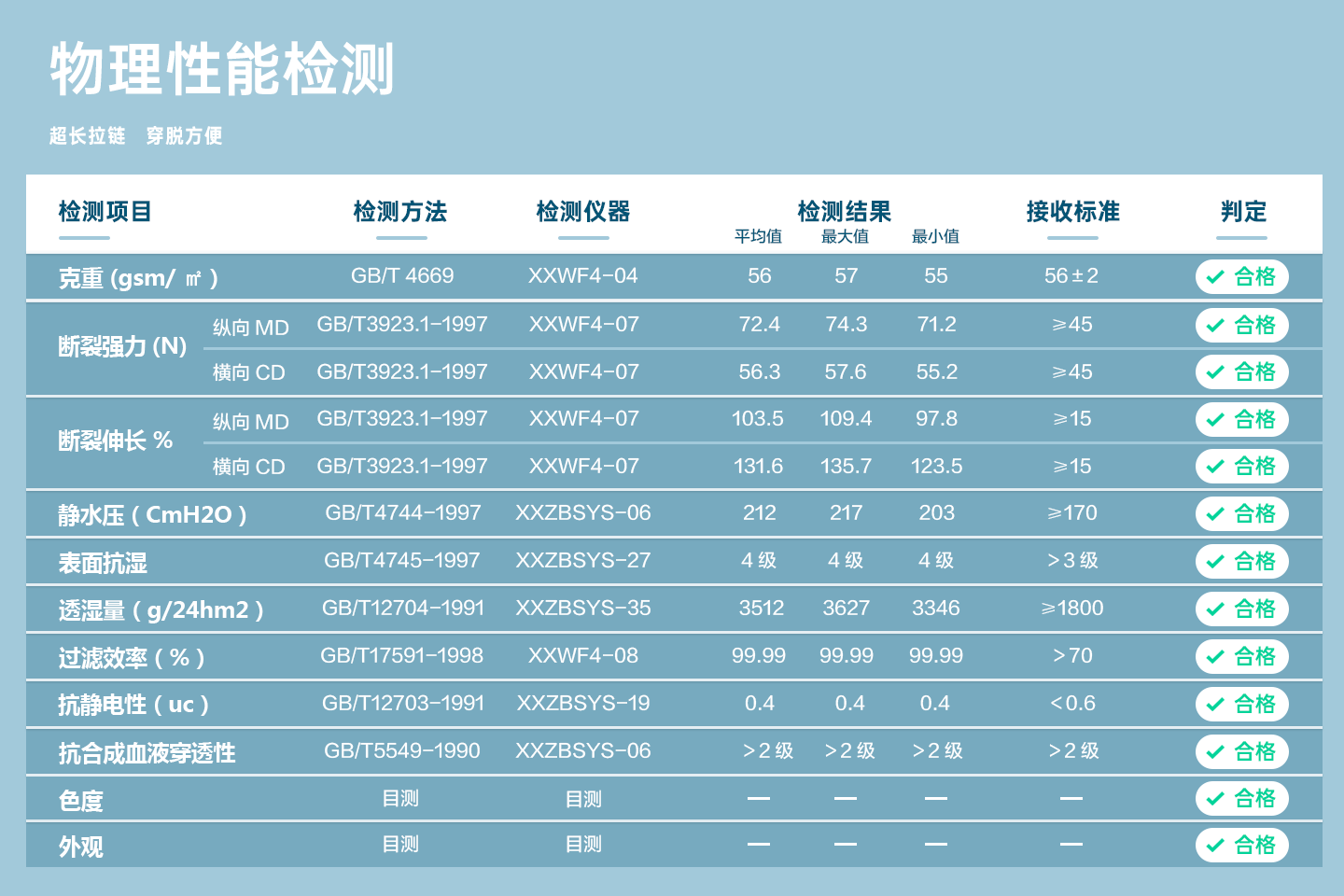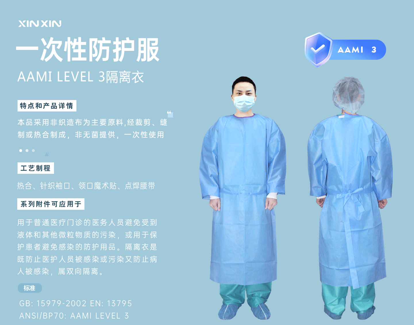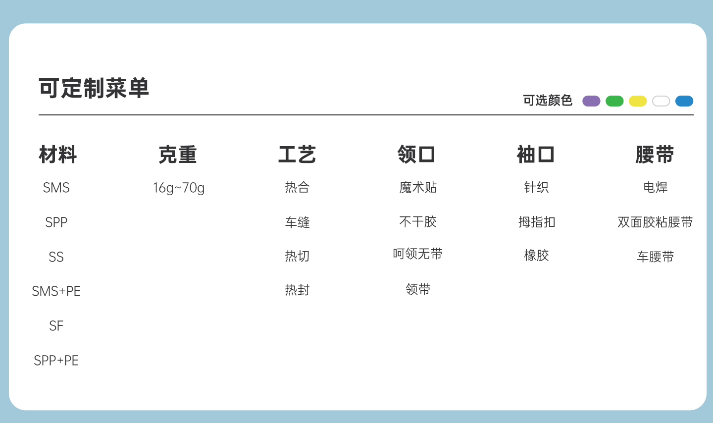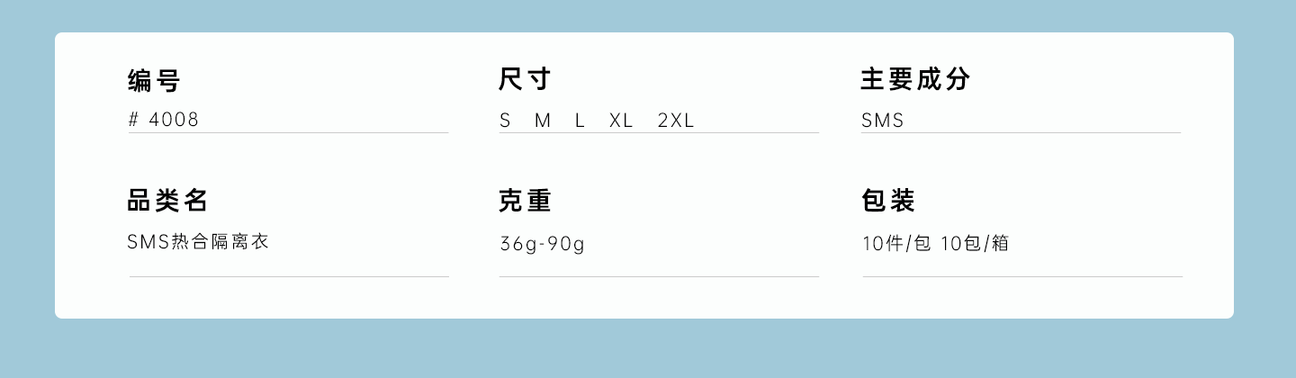 規(guī)格尺寸:S~2XL 主要成分:聚丙烯 克重:36g-90g 顏色:白色、黃色、藍(lán)色 工藝:熱合、針織袖口領(lǐng)口魔術(shù)貼、點焊腰帶 包裝:10件/包 10包/箱