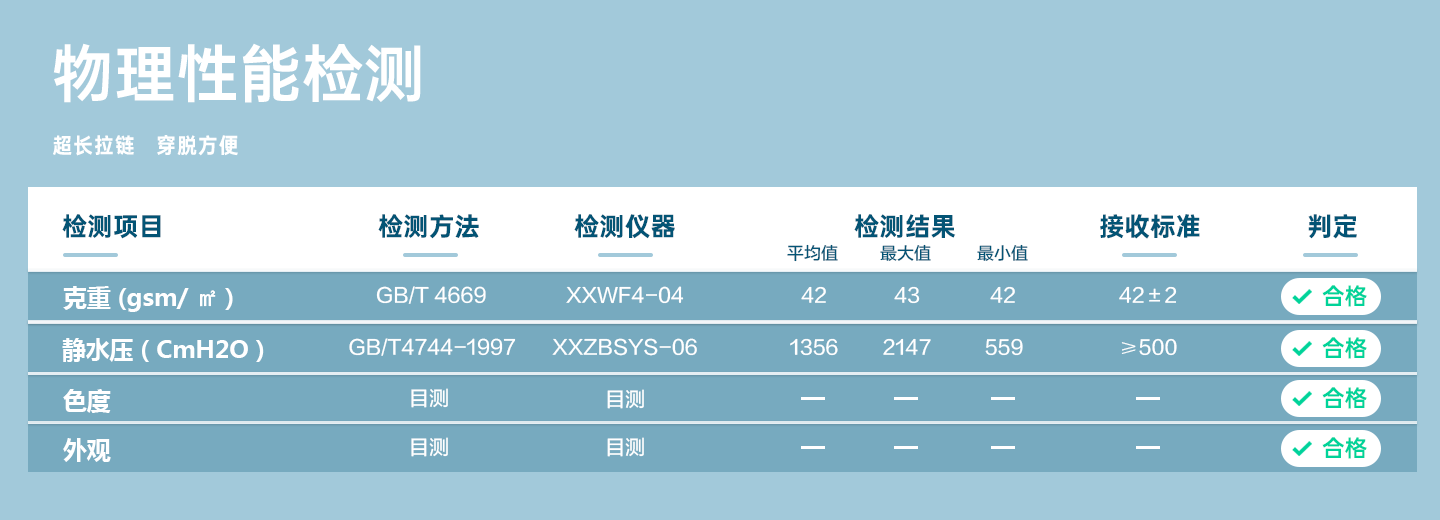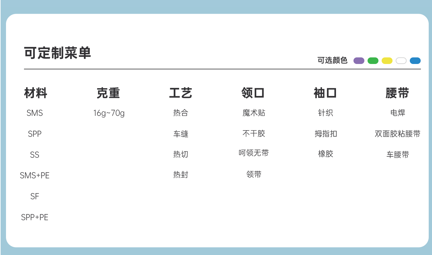 規(guī)格尺寸:S~2XL 主要成分:聚丙烯+聚乙烯 克重:40g-50g 顏色:白色、黃色、藍(lán)色 工藝:熱合、針織袖口領(lǐng)口魔術(shù)貼、點(diǎn)焊腰帶 包裝:10件/包 10包/箱