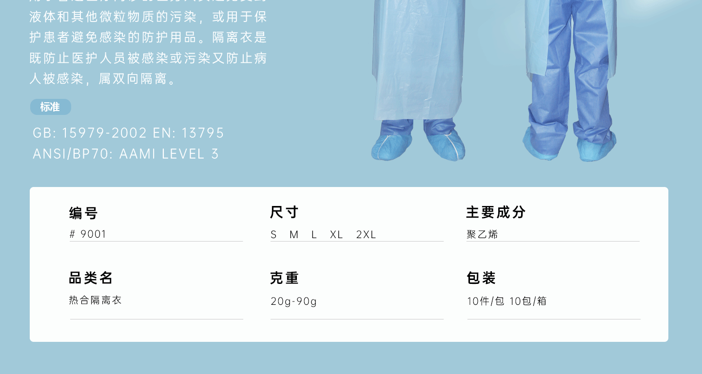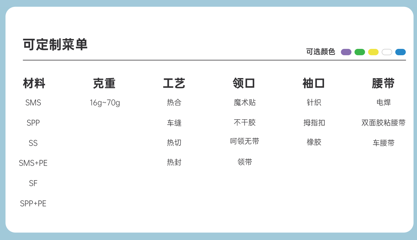 規(guī)格尺寸:S~2XL 主要成分:聚乙烯 克重:20g-90g 顏色:白色、黃色、藍色 工藝:熱合、拇指扣袖口套頭式、無后背、自身腰帶 包裝:10件/包 10包/箱