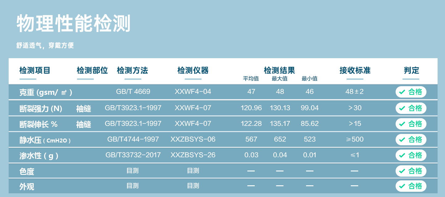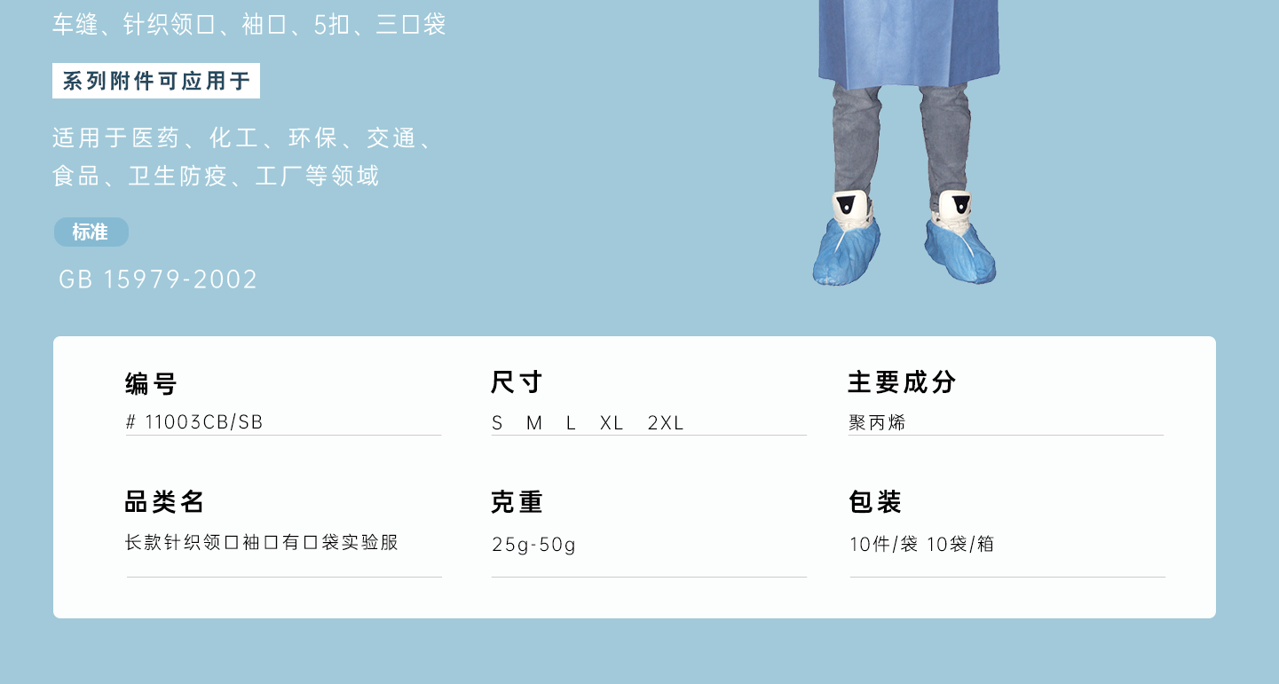 規(guī)格尺寸:S~2XL 主要成分:聚丙烯 克重::25g-50g 顏色:白色、藍色、深藍、淺藍、紫色 工藝:車縫、針織領(lǐng)口、袖口、5扣、三口袋 包裝:10件/袋 10袋/箱