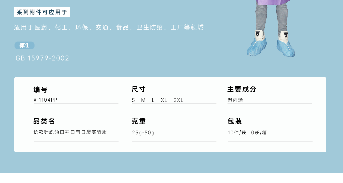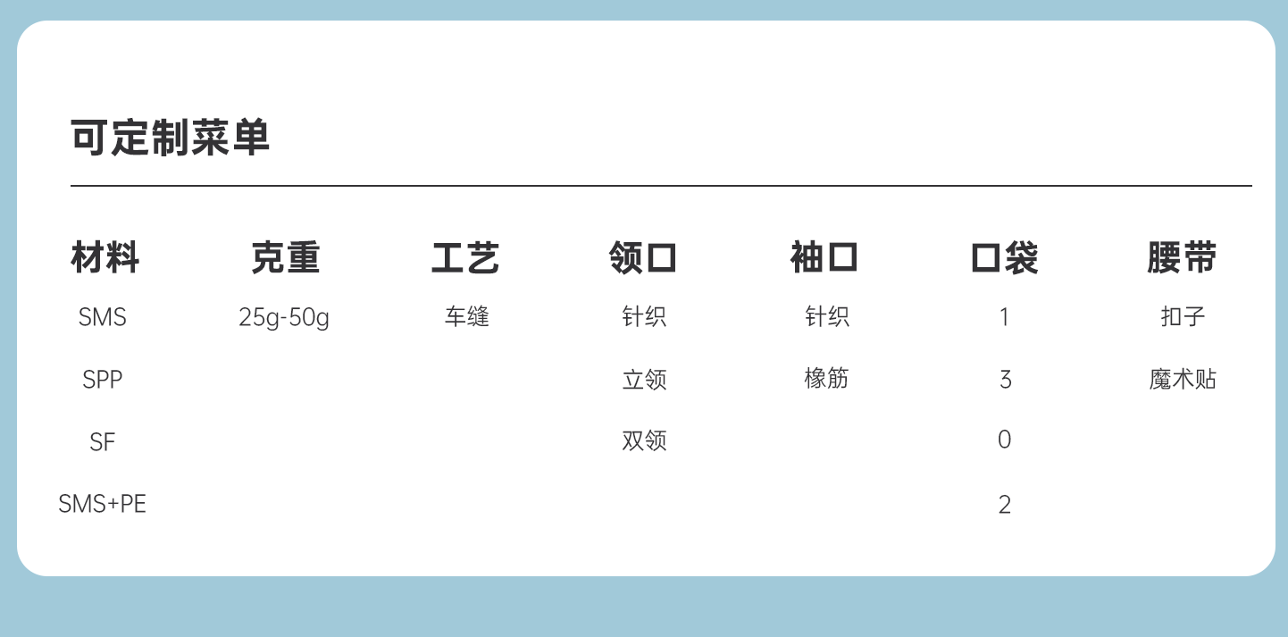 規(guī)格尺寸:S~2XL 主要成分:聚丙烯 克重:25g-50g 顏色:白色、藍(lán)色、深藍(lán)、淺藍(lán)、紫色 工藝:車(chē)縫、針織領(lǐng)口、袖口、5扣、三口袋 包裝:10件/袋 10袋/箱