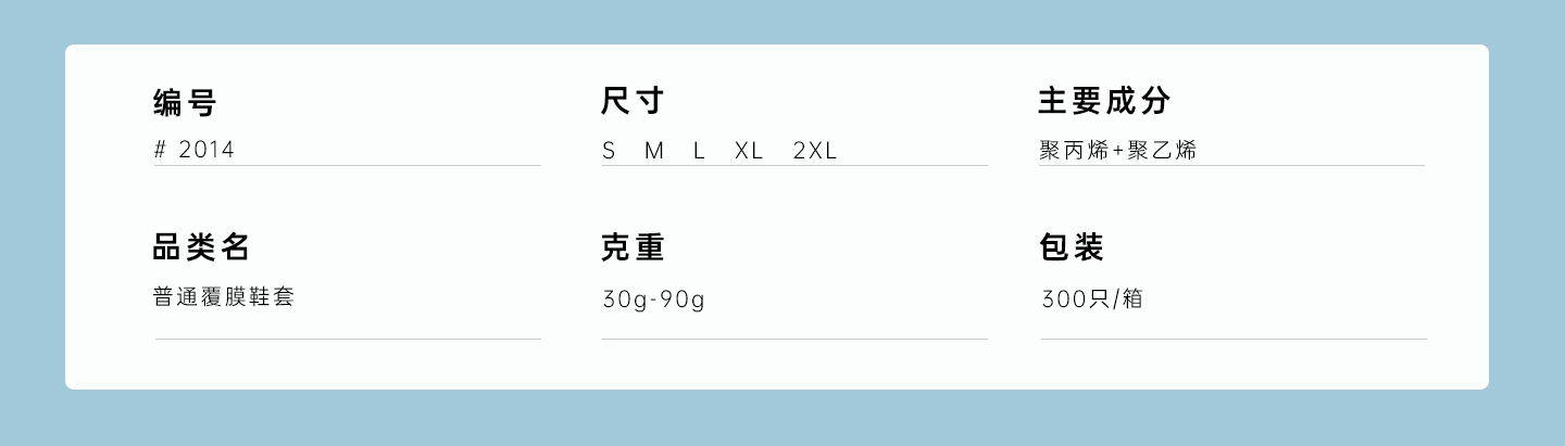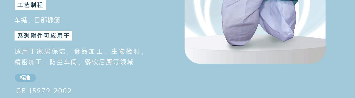 規(guī)格尺寸:S~2XL 主要成分:聚丙烯+聚乙烯 克重:30g-90g 顏色:白色、藍(lán)色、深藍(lán)、淺藍(lán)、紫色 工藝:車(chē)縫、口部橡筋 包裝:300只/箱